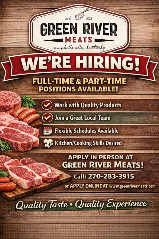 A Few Words About Green River Meats Full-time & part-time positions available Back to Jobs Green River Meats Full-time & part-time positions available By Green River Meats 2/12/2026 Green River Meats Full-time & part-time positions available.Kitchen/Cooking skills a plus! Apply in person 270-283-3915 www.greenrivermeats.comQuality Taste. Quality Experience. Images × Share × Email Facebook LinkedIn X Pinterest Powered By GrowthZone