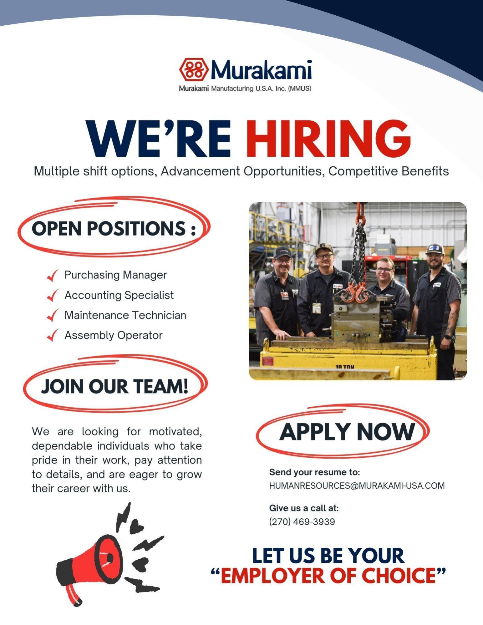 A Few Words About Murakami Manufacturing Back to Jobs Murakami Manufacturing By Campbellsville-Taylor County Chamber of Commerce 1/13/2026 Images Images × Share × Email Facebook LinkedIn X Pinterest Powered By GrowthZone